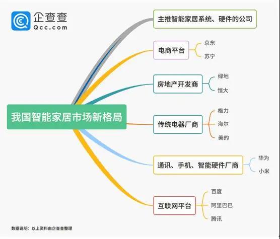 不過(guò),目前中國(guó)智能家居市場(chǎng)正在形成新的格局,企查查整理了部分涉足智能家居的品牌,大致分布在這六大陣營(yíng):主推智能家居概念的智能家居系統(tǒng)和智能家居硬件初創(chuàng)公司陣營(yíng);以格力、海爾、美的等為代表的傳統(tǒng)電器廠商陣營(yíng);以華為、小米等為代表的通訊、手機(jī)、智能硬件廠商陣營(yíng);以BAT為代表的互聯(lián)網(wǎng)平臺(tái)陣營(yíng);以京東、蘇寧等為代表的電商平臺(tái);以綠地、恒大為代表的房地產(chǎn)開(kāi)發(fā)商。